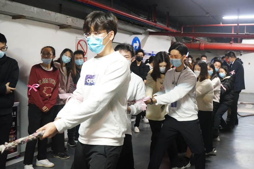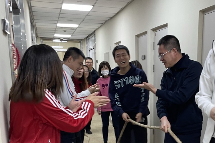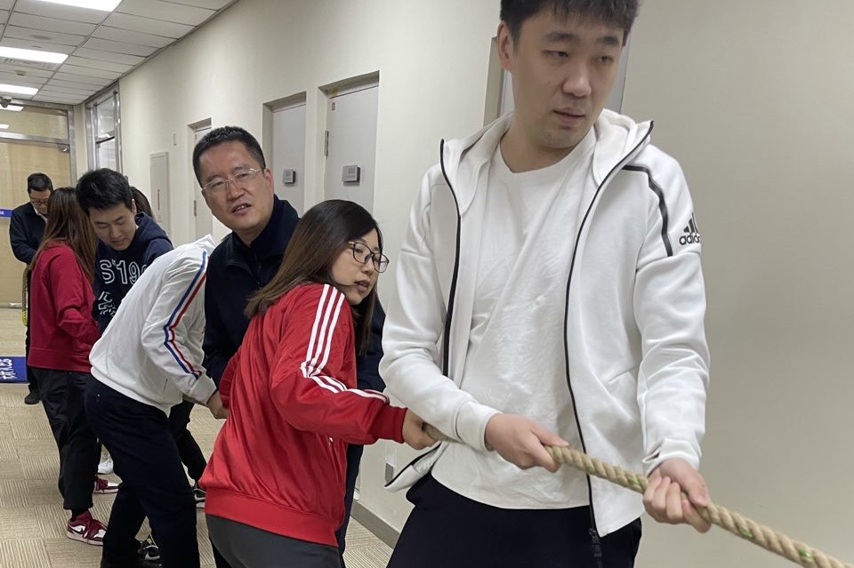 再觀北京分會場,參賽職員身穿中國紅運動服,寓意新的一年紅紅火火,同時也為冬奧會加油助威?,F場由飛虎隊和龍騰虎躍隊進行回合制的拔河競賽。在每一回合結束后,雙方進行了認真的戰術討論和調整,經過激烈的比拼,最終龍騰虎躍隊稍勝一籌,在“一二、一二”的號子聲中,取得了比賽的勝利。