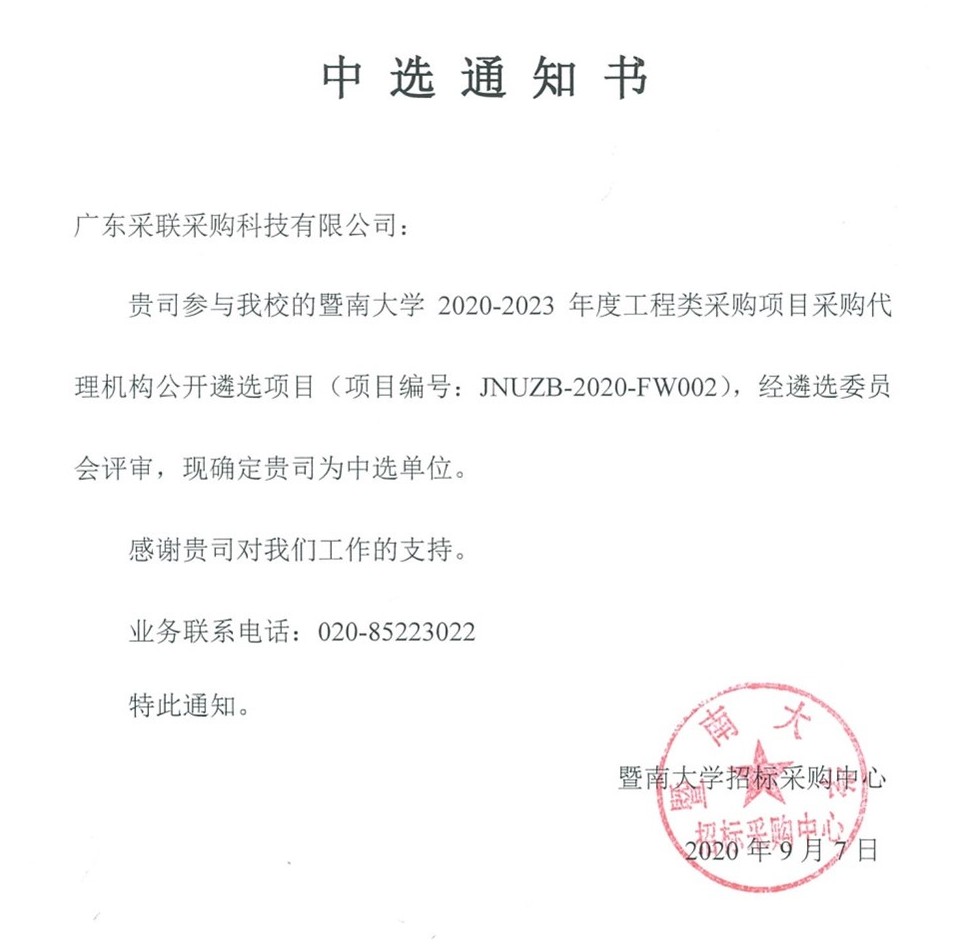 2020年8月2日,暨南大學(xué)開(kāi)展了“2020-2023年度工程類(lèi)采購(gòu)代理機(jī)構(gòu)”的遴選工作,廣東采聯(lián)采購(gòu)科技有限公司(以下簡(jiǎn)稱(chēng):采聯(lián)科技)成功入選為"暨南大學(xué)2020-2023年度工程類(lèi)采購(gòu)項(xiàng)目采購(gòu)代理機(jī)構(gòu)"。