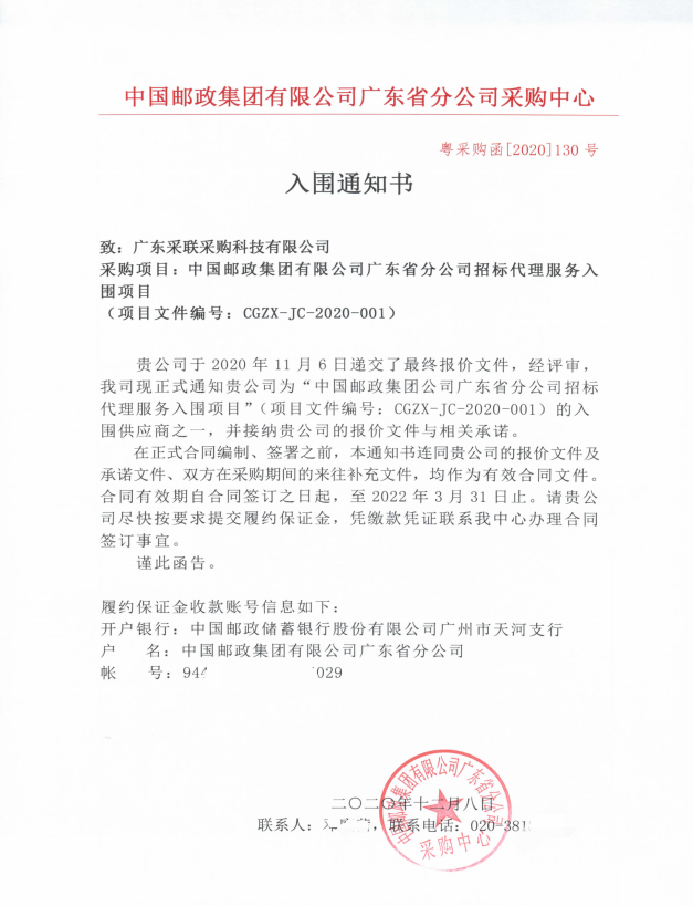 2020年11月4日,中國郵政集團有限公司廣東省分公司開展了“中國郵政集團有限公司廣東省分公司招標代理服務入圍項目” 的遴選工作,廣東采聯采購科技有限公司(以下簡稱:采聯科技)成功入圍"中國郵政集團有限公司廣東省分公司招標代理服務入圍項目"。